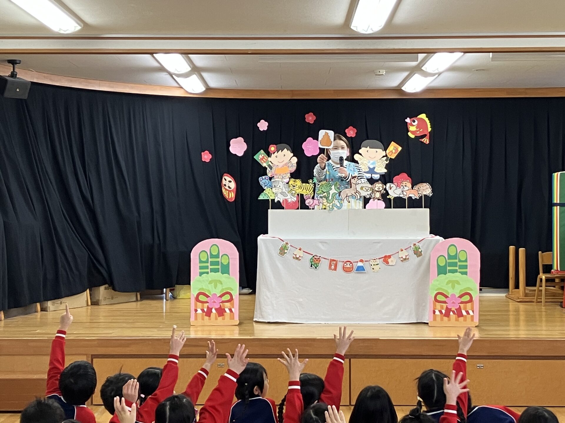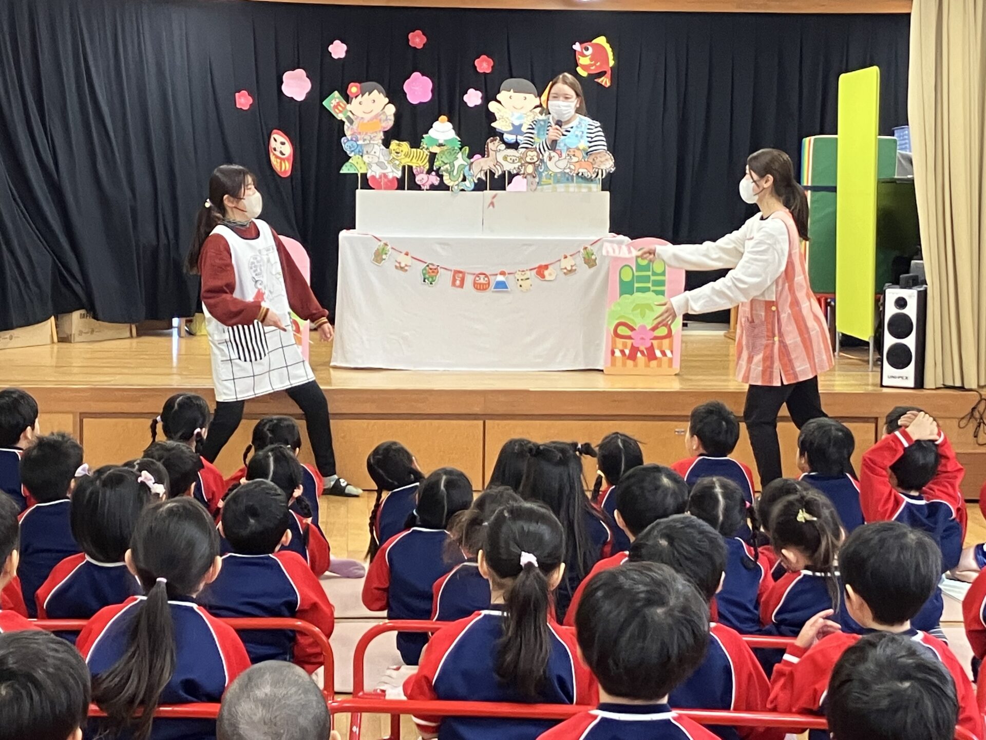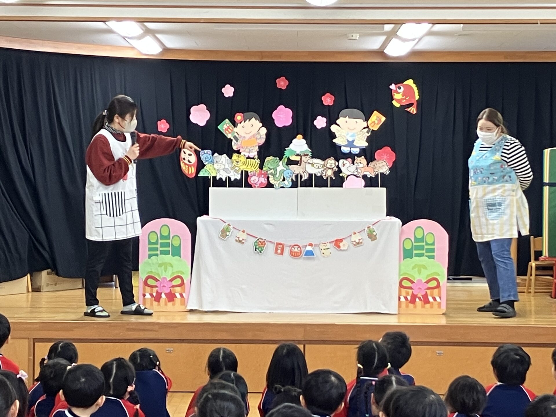 ペープサートで「十二支のはなし」を見ましたよ。「私はねずみ年」「え⁉僕もだよ!」と顔を見合わせて驚いてる姿が可愛かったです💕
