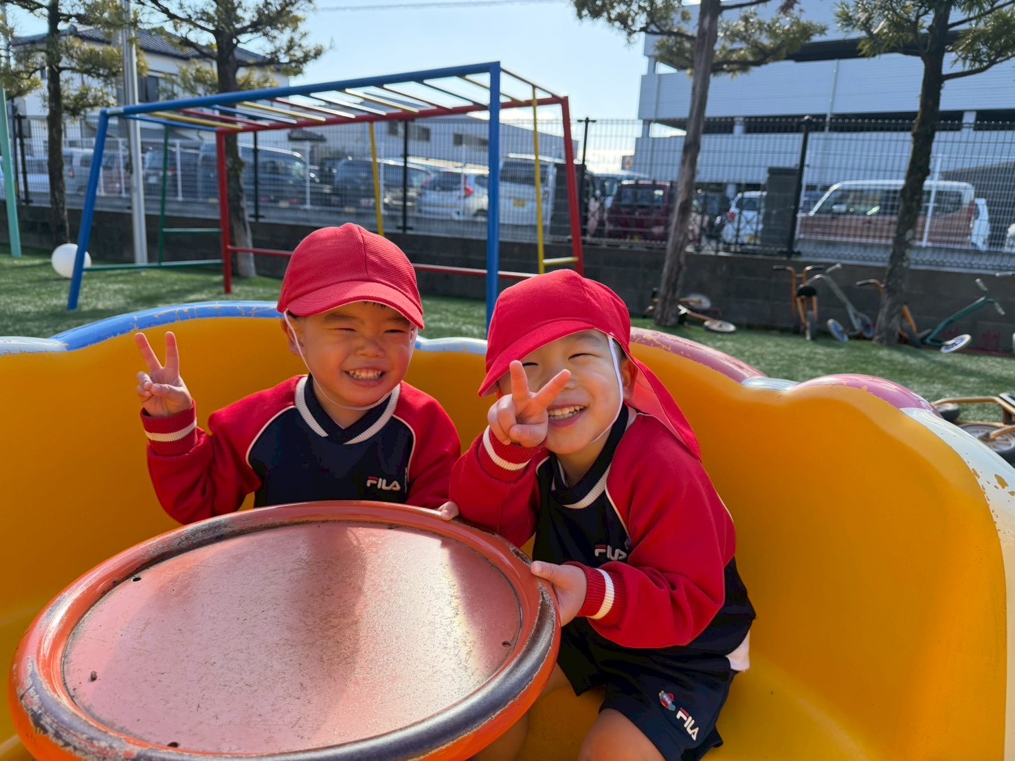 回転遊具に乗って息を合わせてグルグル回していましたよ!