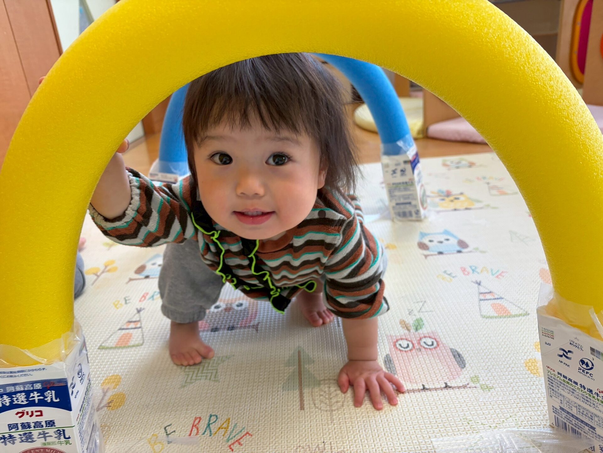 お部屋で運動遊びをしましたよ!トンネルをくぐって覗いている様子が可愛らしいですね💓