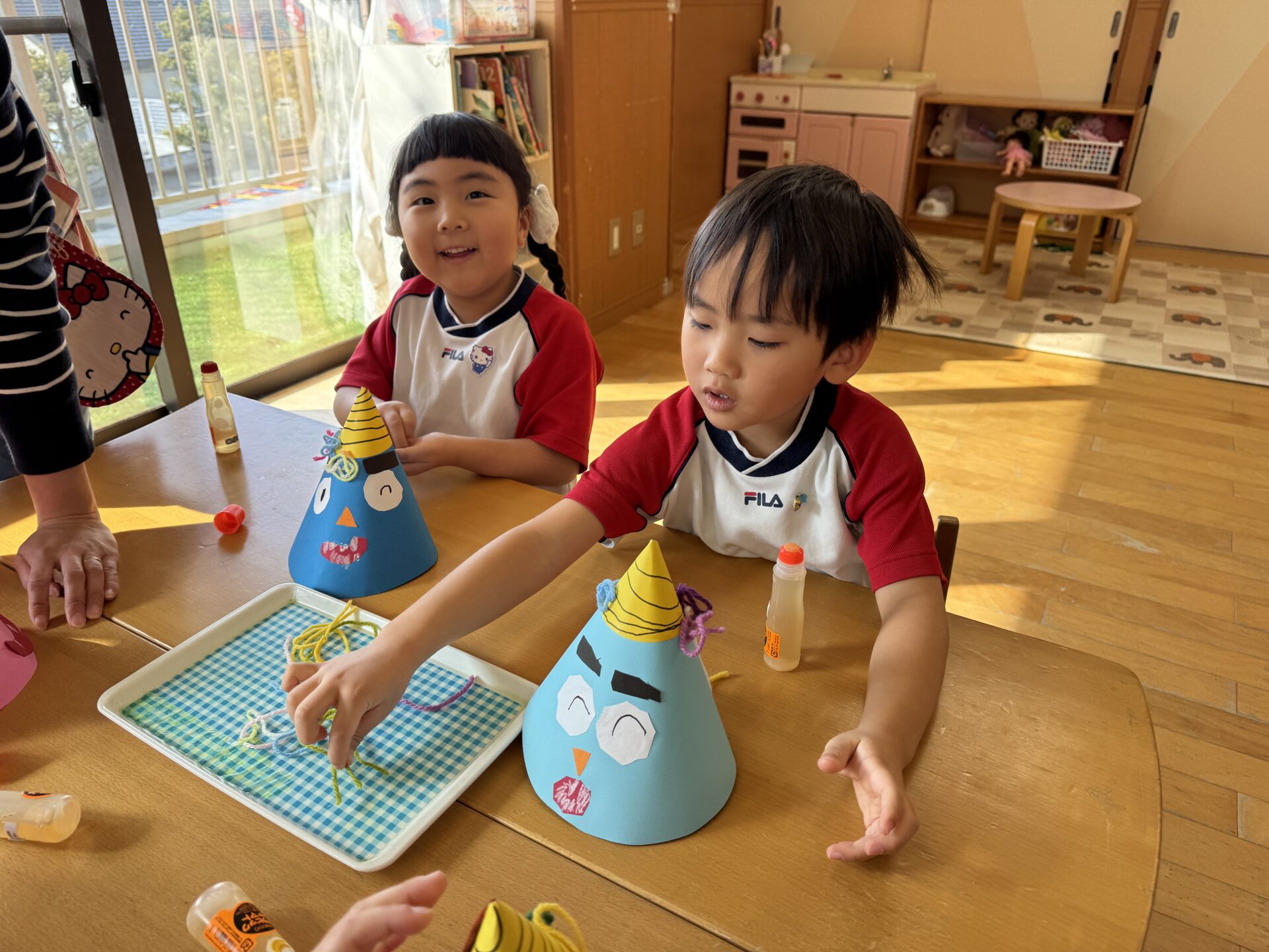 鬼のお面製作を行いました!毛糸を丸めて頭の部分に一つずつ丁寧に貼っていきましたよ🧶