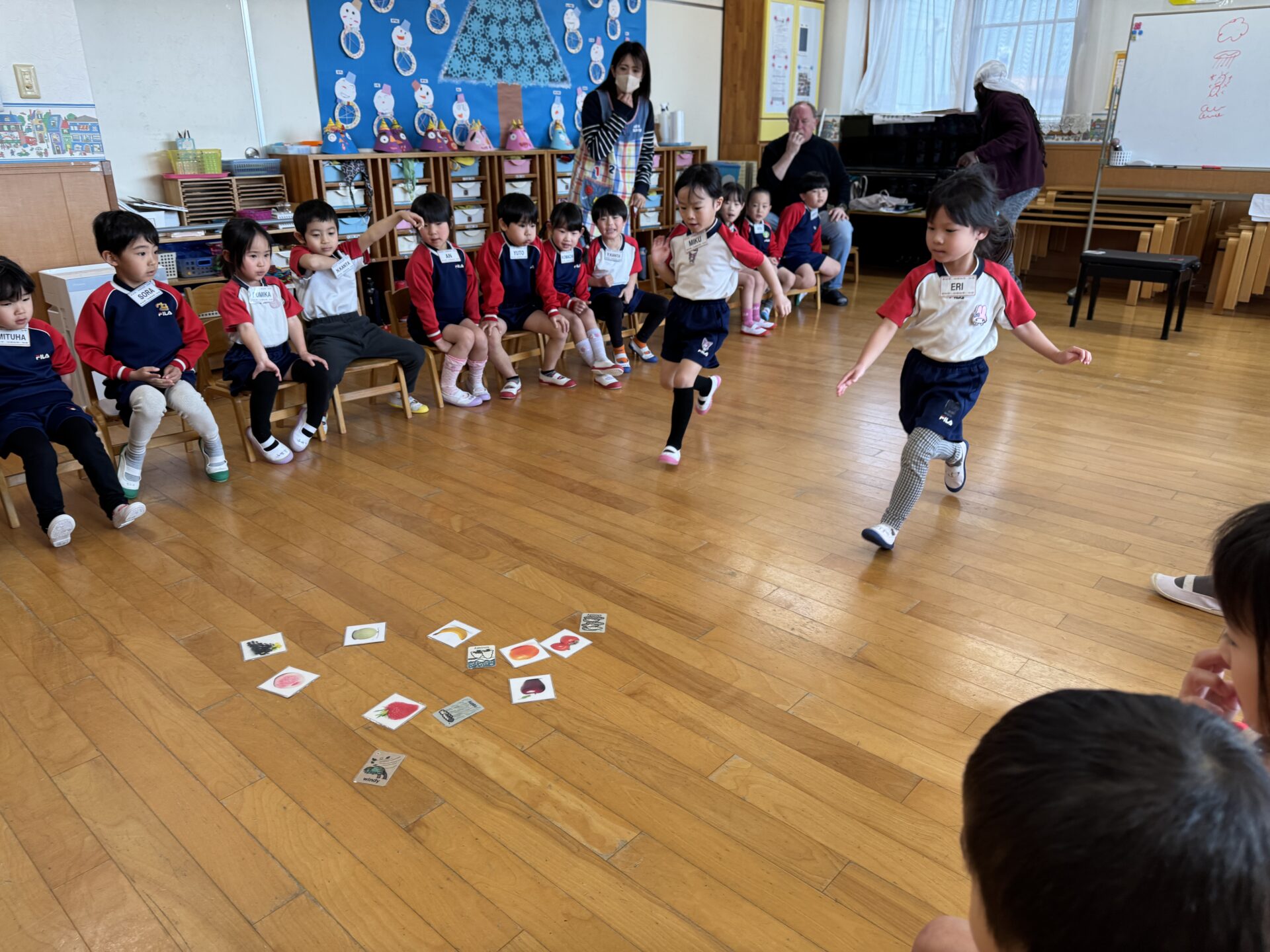 英語をしっかり聞いて、言われた果物を探してカードを取るというルールで行いました。きく組さんとても早かったですよ👏