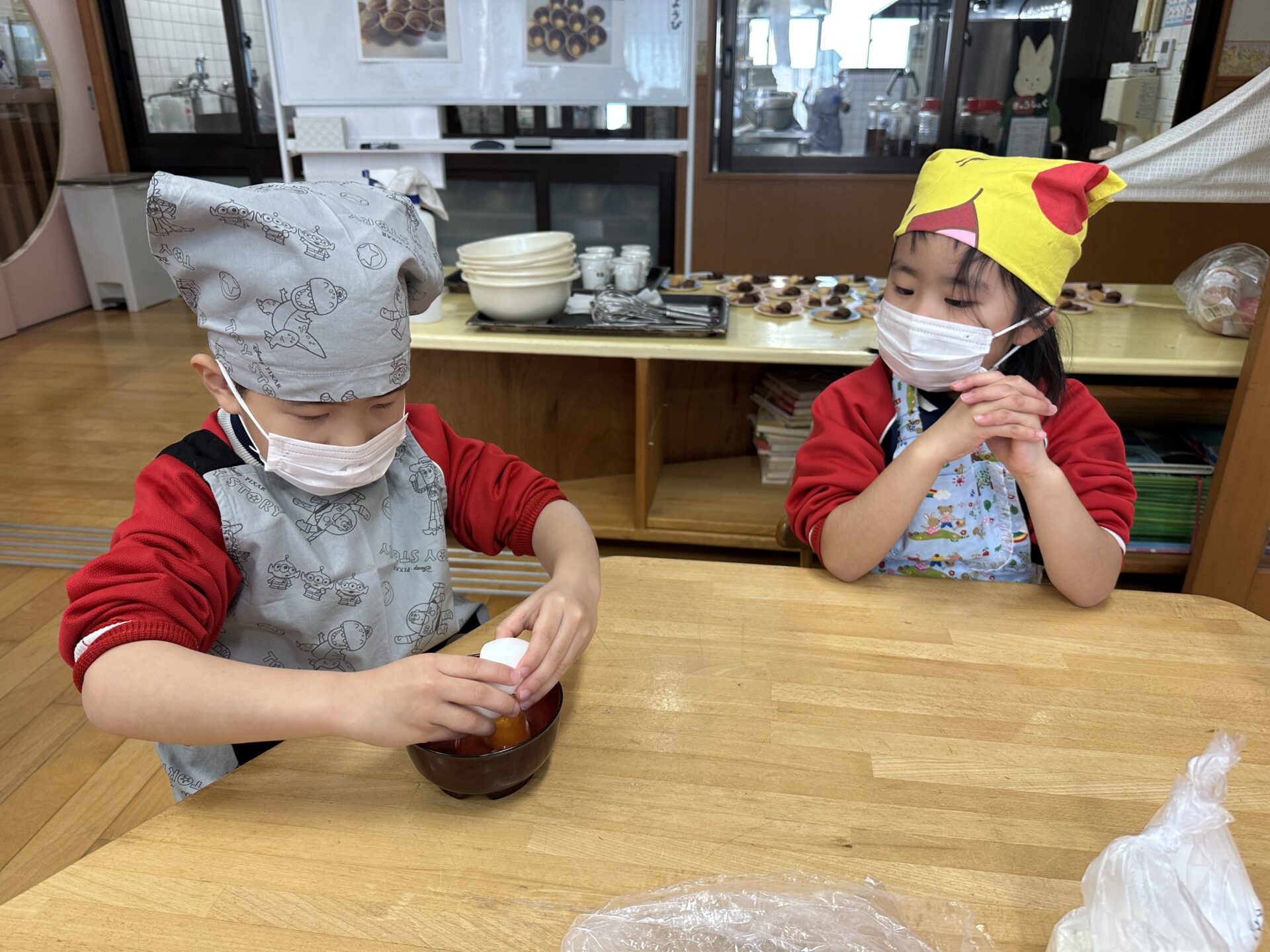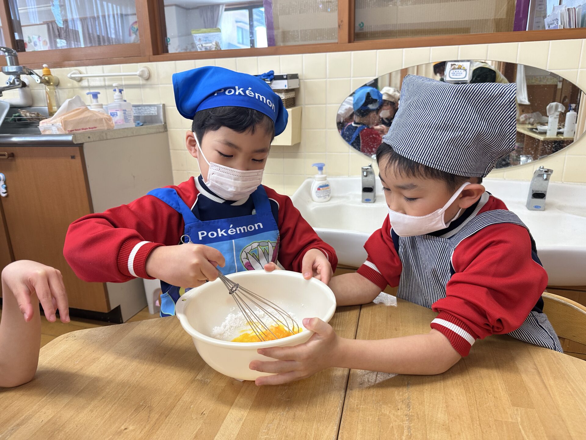卵を割るときは少しドキドキしている様子もありましたが、「おうちでやったことあるよ!」という声も多く、みんなとても上手に割ることができました。