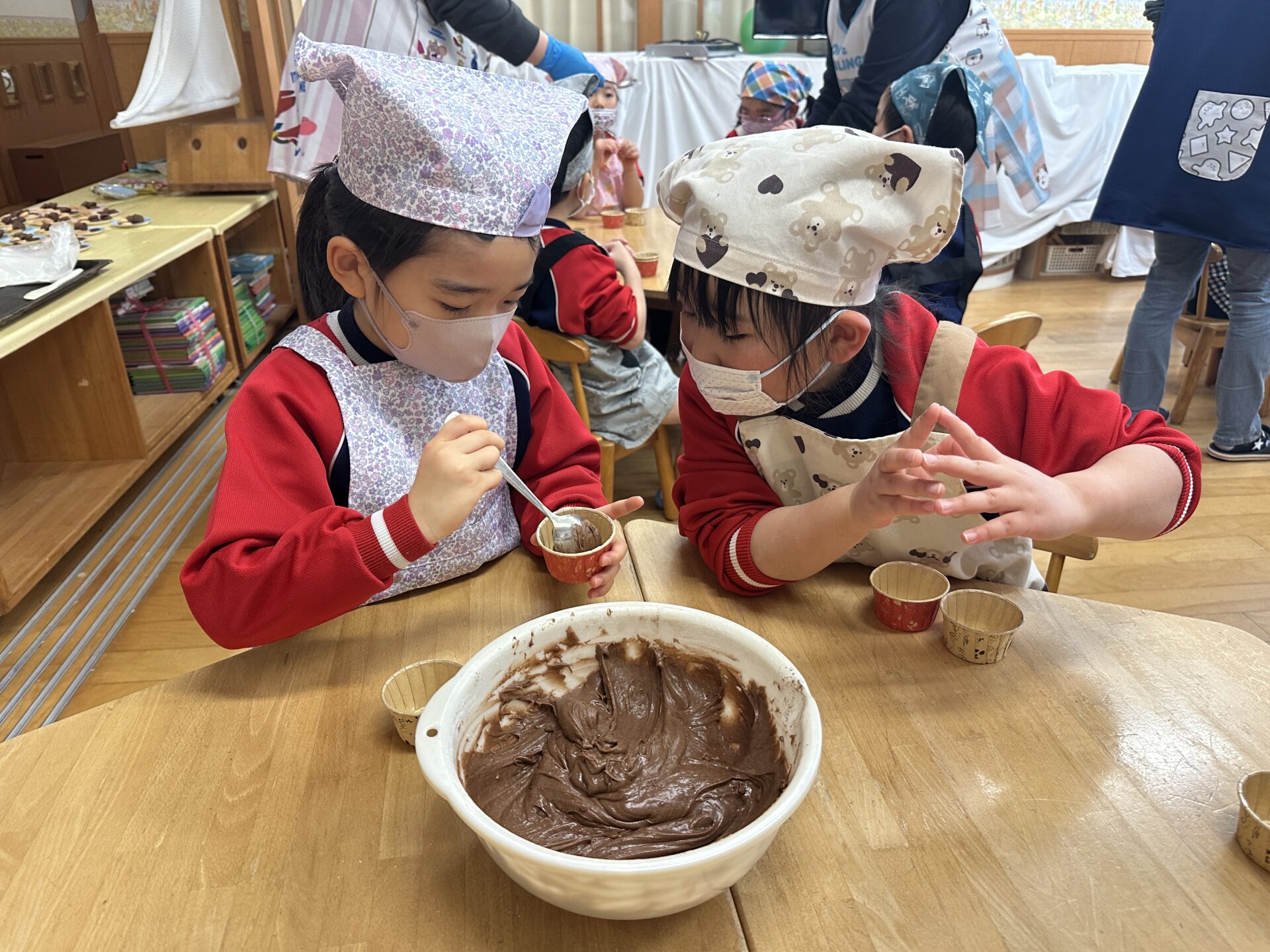 明日のバレンタインを前に、年長のひまわり組さんがくまのカップケーキ作りに挑戦しました。