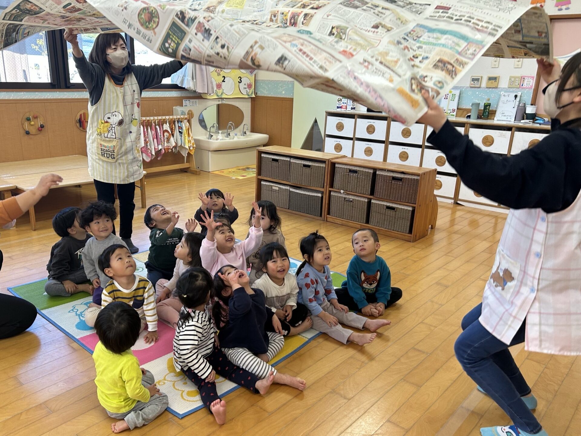 新聞紙をたくさんつなげた、大きな新聞紙バルーンで遊びましたよ🌟