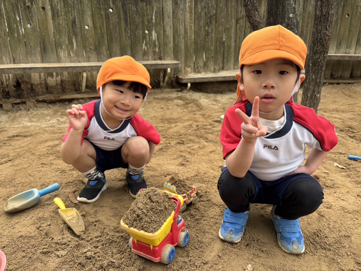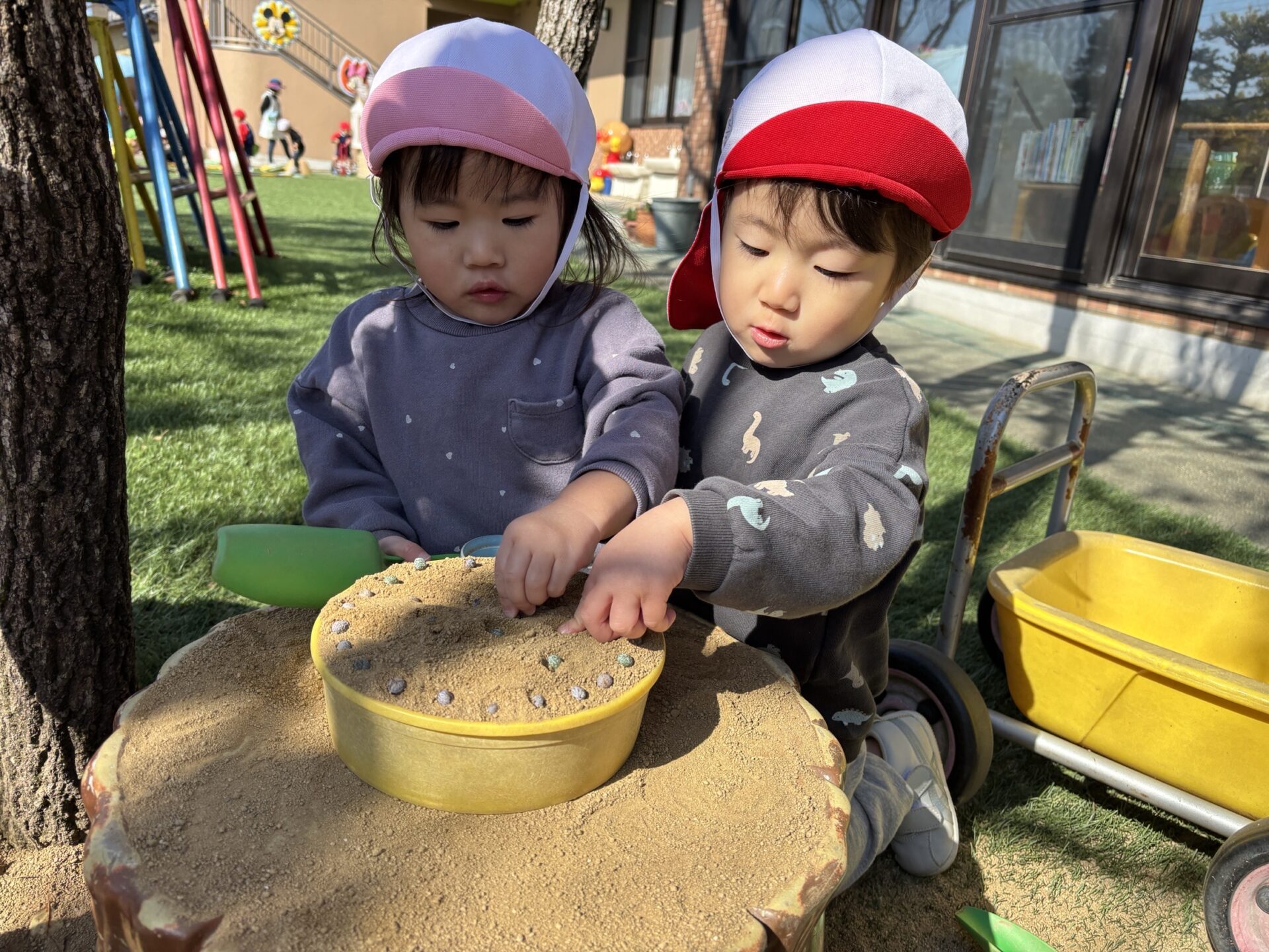 お外に出ると、お気に入りのおもちゃや遊具にみんなまっしぐら😆砂場でお友達と楽しそうに遊んでいますね~♡
