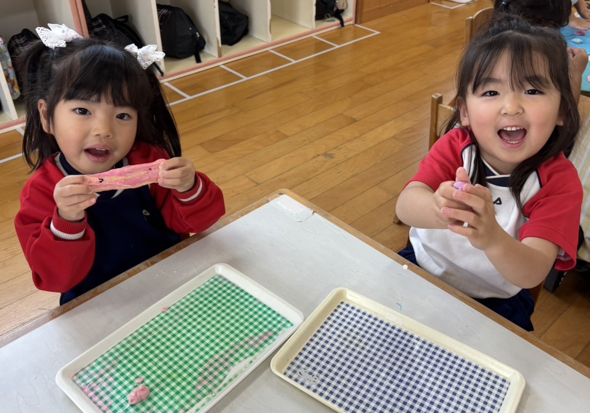 普段遊んでいる粘土とはまた違った感触に「きもち~!」「びよ~んって伸びるね!」と楽しそうな子どもたちでした😊いろんな色を混ぜて遊ぶ様子も見られましたよ💕