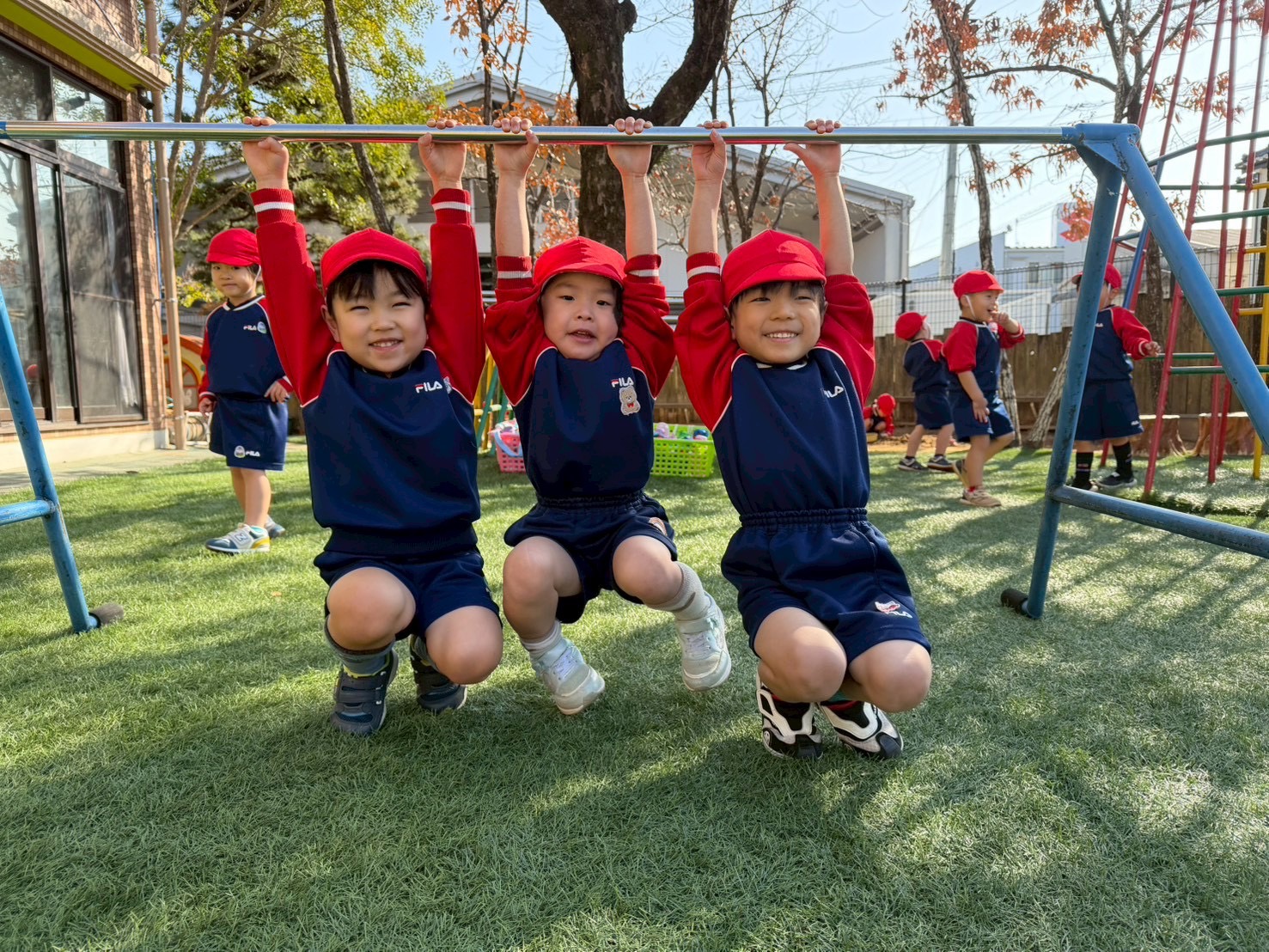 お外遊びをしている様子です!鉄棒にぶら下がり、最後まで残るのは誰か🔥競い合っていますね✨
