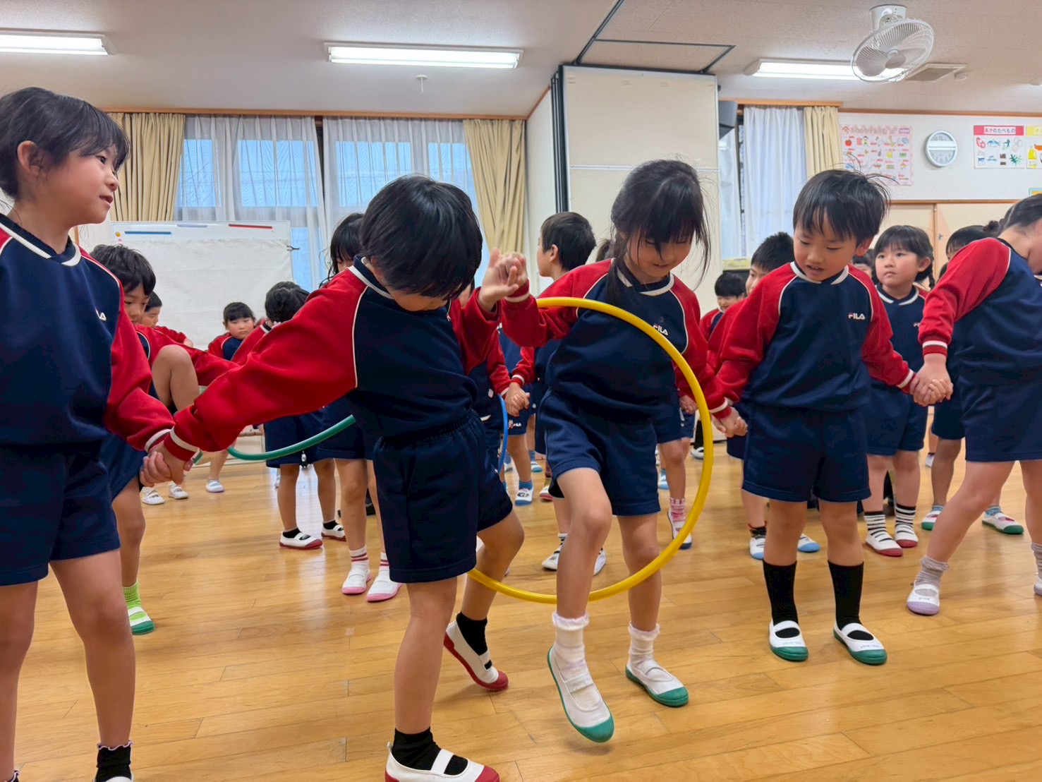 ゲームあそびでは、4チームに分かれてフラフープリレーや爆弾ゲームをして盛り上がりました😆✨