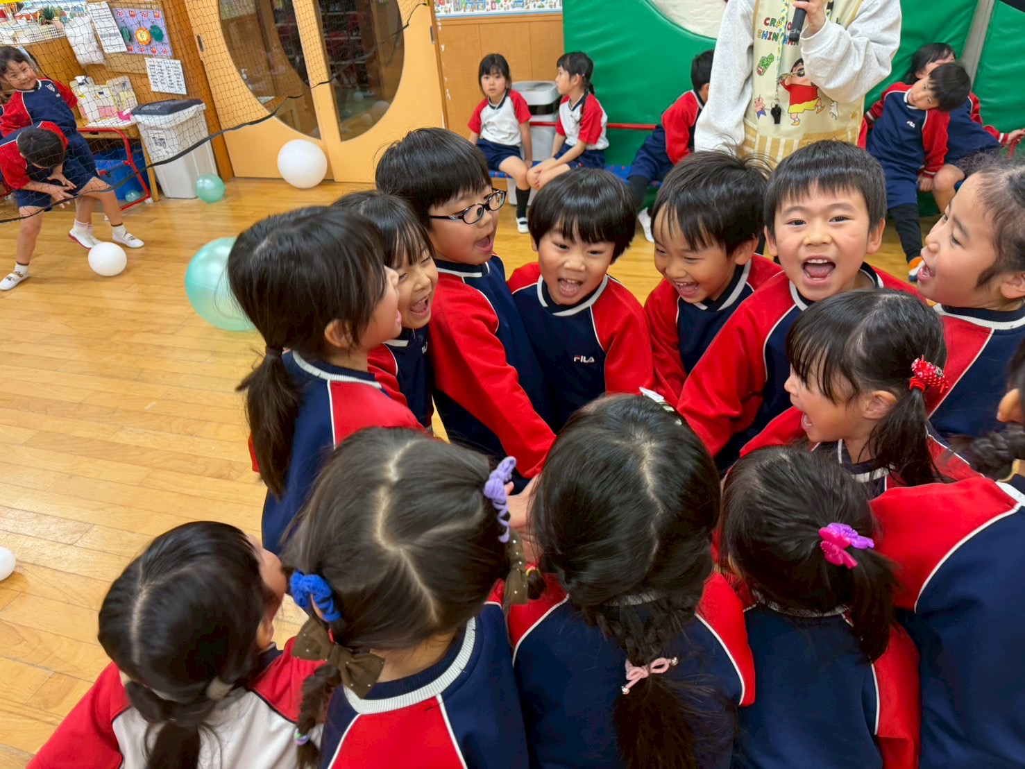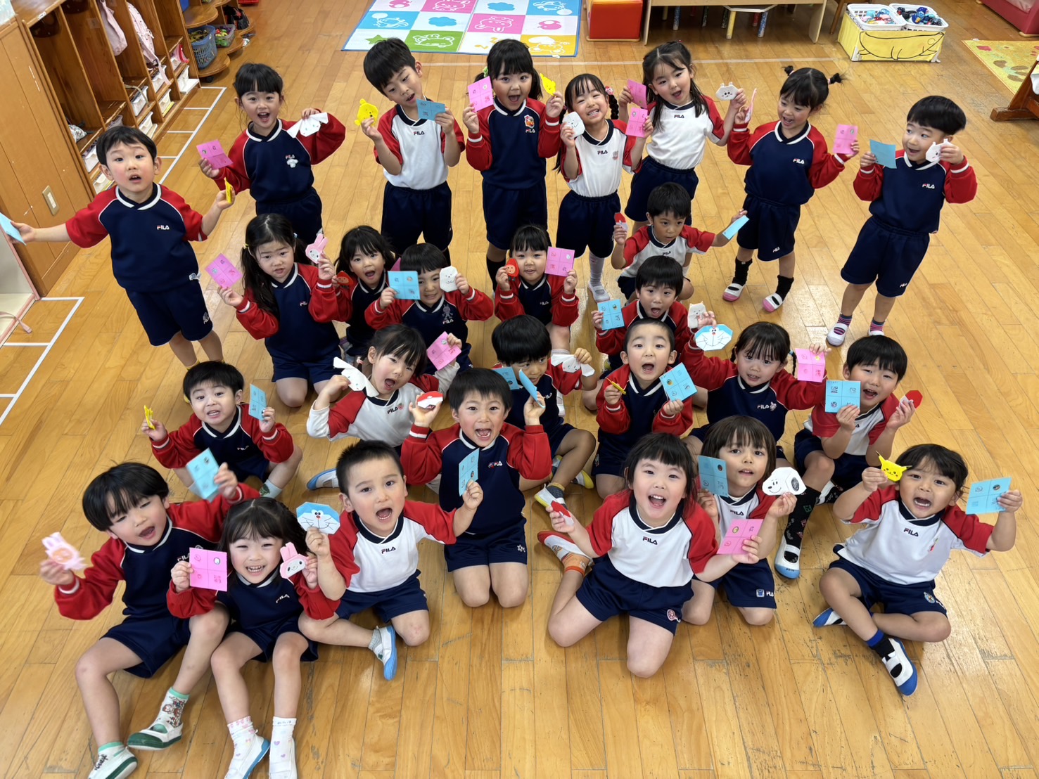 ひまわり組、きく組の子どもたちは遊戯室に集まって一緒に過ごしましたよ🎵