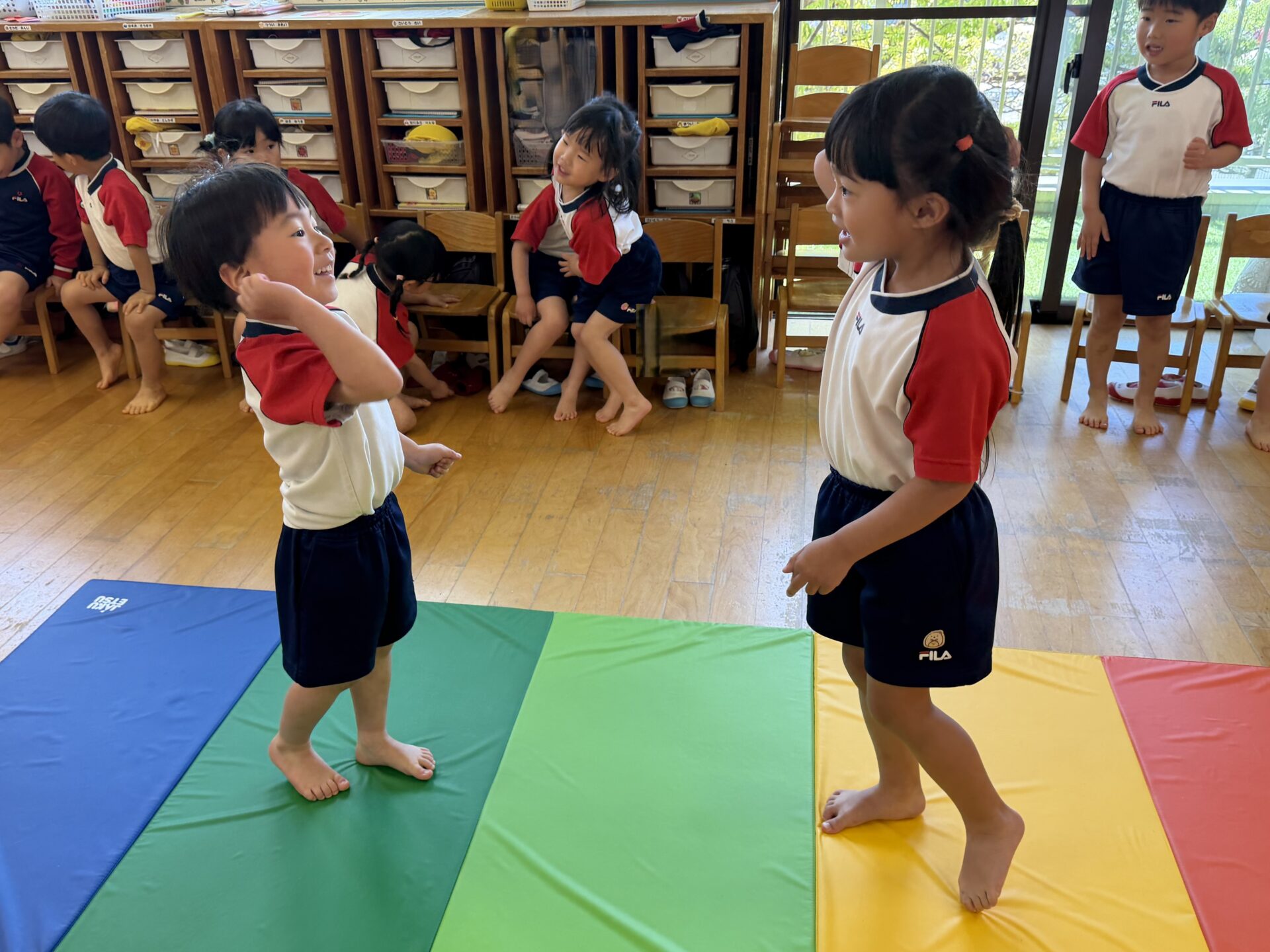 マットの上をけんけんで進み、お友達とじゃんけんをして楽しんでいますよ~!