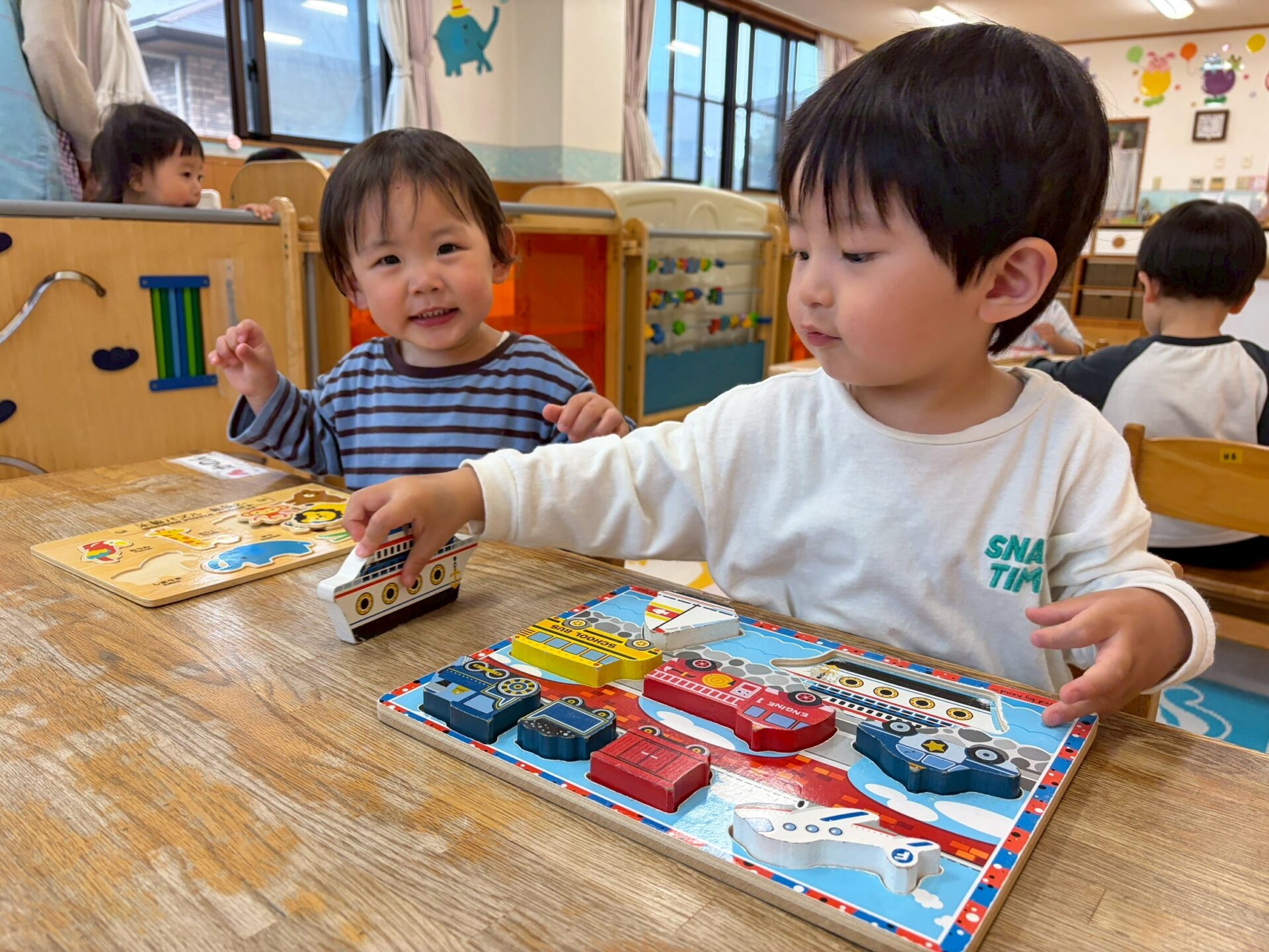 お部屋にある、いろいろなパズルをして楽しんでいる様子です!上手に型にはめて楽しんでいますよ✨