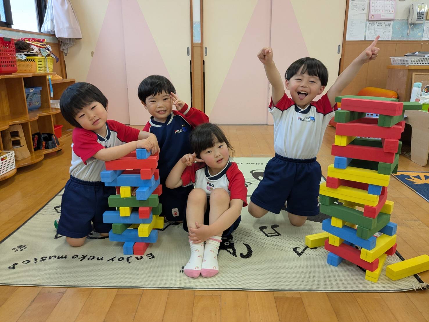 みんなでソフトブロックの積み上げ対決をしている様子です✨