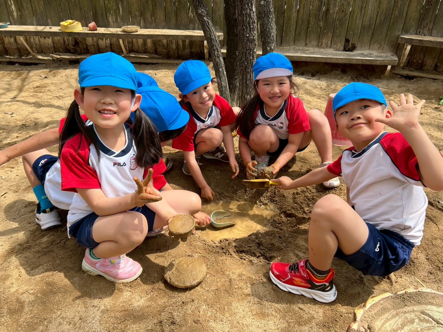 砂場で泥団子を作って遊んでいる様子です!