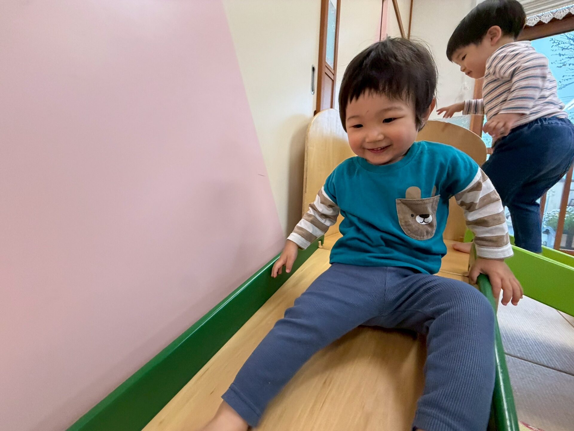 すべり台で楽しそうに遊んでいますね🎵お部屋でも元気いっぱいの子どもたち😊たくさん体を動かして遊んでいますよ!
